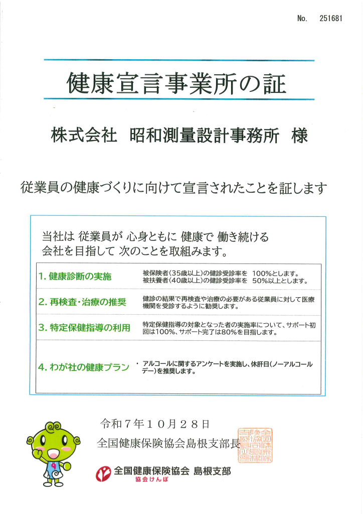 「健康宣言事業所の証」をいただきました。 島根県では健康長寿日本一を目指し、働き盛り世代の健康づくりを推進されています。当社では、その第一歩として、健康宣言エントリーを行い、従業員のみなさまが心身ともに健康で働き続けられるように、引き続き「健康経営」に取り組んでいきたいと思います。