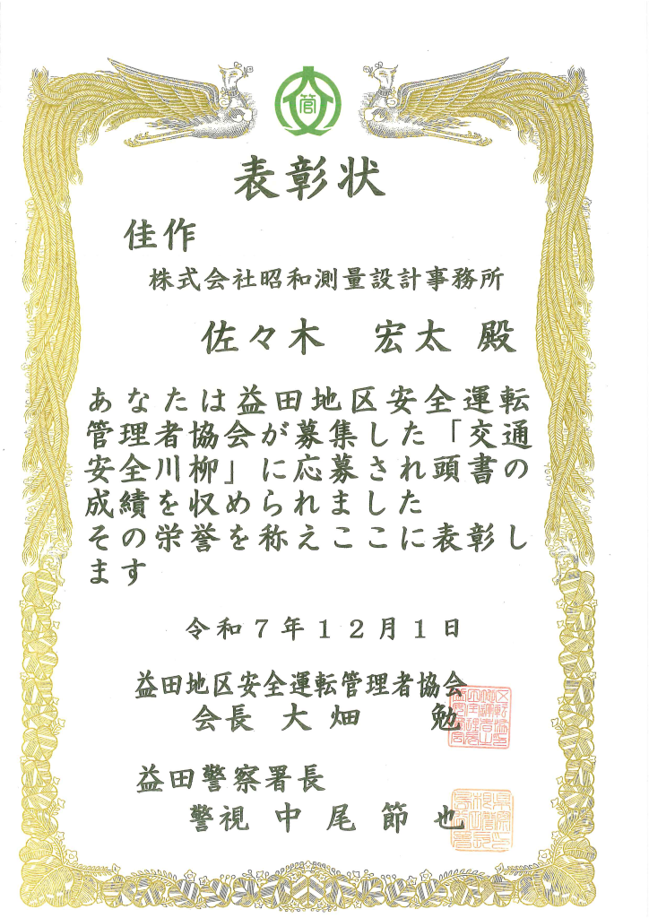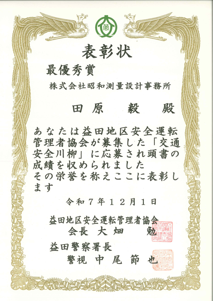 益田地区安全運転管理者協会が主催する「交通安全川柳大会」に参加し、「最優秀賞」と「佳作」に選ばれました。 当社では、職員の交通安全意識高揚を目的に、益田地区安全運転管理者協会が主催する「交通安全川柳大会」に全職員が毎年参加しています。他企業からも多くの作品が出品されますが、当社の職員の作品もこれまで数多くの入選作品を輩出しています。その中で、本年は当社の職員から最優秀賞と佳作に選ばれました。 最優秀賞 「あなたにも 無事故を祈る 人がいる」 代表取締役 田原 毅 佳 作 「急ぐなら スピードよりも 出る時間」 測量設計課 佐々木 宏太